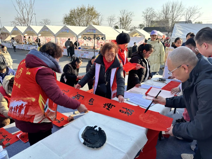 活动现场,墨香四溢,红纸铺展,大师们挥毫泼墨,尽显书法才艺,一幅幅精美的春联饱含着对新春佳节的美好祝福,其笔墨之间洋溢着温馨与喜庆。这些寓意吉祥的春联,为即将到来的春节增添了浓郁的年味。居民们从各处赶来,孩子们在人群中欢笑嬉戏。大家纷纷围在书写现场,有的对老师们的书法技艺赞不绝口,有的认真挑选心仪的春联,欢声笑语萦绕四周,为元旦佳节增添了温馨欢乐的氛围。