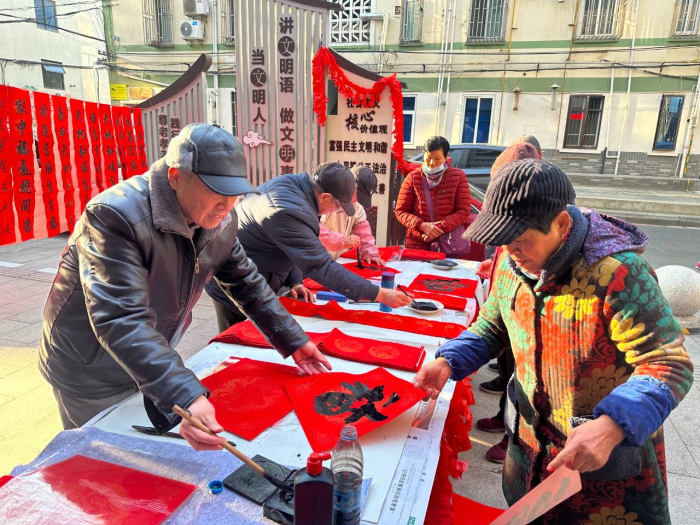 活动前,社区工作人员早早地来到现场,精心布置起充满新年氛围的装饰,将社区门口装点得喜气洋洋,营造出一个温馨、欢乐的节日环境,吸引着过往居民的目光。活动现场,书画队的人员们挥毫泼墨,现场写春联、写福字。他们神情专注,笔走龙蛇,一幅幅寓意吉祥的春联和一个个苍劲有力的福字在他们的笔下诞生。墨香四溢,吸引了许多居民前来挑选。居民们围在书桌旁,有的认真挑选着自己心仪的春联,有的赞叹着书画队人员们的精湛技艺,现场气氛十分热烈。