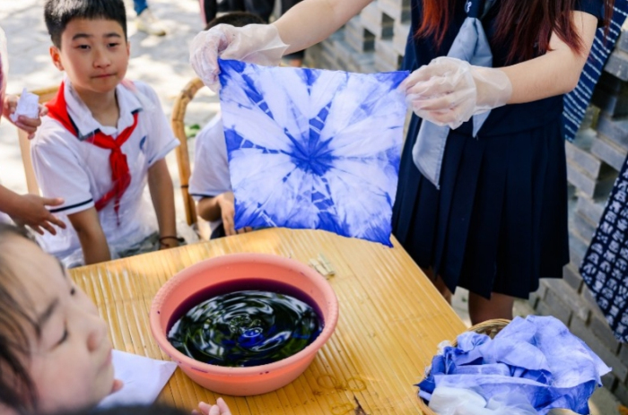 学习扎染课程。认员们根据自己的兴趣喜好“兵分两路”,其中一路就是在工作人员的指导下感受民间--扎染的魅力。一块白色棉布,一盆清水,一盆染料,怎样在几十分钟内实现“美丽变艺一身”?队员们对扎染工艺充满了新鲜与好奇。队员们聚精会神地看着工作人员的动作示范,牢记要领。 当队员们将染好的布层层拆开,一幅幅漂亮的扎染图案跃然眼前,有同学忍不住惊呼:“这真的是环球体育做成的吗?”兴奋之情溢于言表。工作人员为队员们揭开了扎染的奥秘:棉布绑扎处因染料无法渗入而形成深浅不均、层次丰富的色晕和皱印,最终就会形成千姿百态的图案。