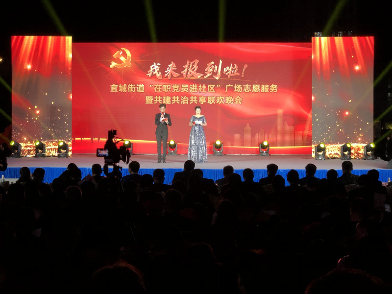 晚上6::30“我来报道啦”——宜城街道“在职党员进社区”共建共治共享联欢晚会在岳堤广场隆重举行,联欢晚会在《幸福中国一起走》的音乐声中开场,中共宜兴市委组织部副部长周辉为晚会作了致辞。此次联欢晚会分为三个篇章进行,第一篇章:共建红网格,宜城街道对新开发的“在职党员进社区”小程序进行了发布;第二篇章:携手双服务,中共宜兴市委组织部副部长周辉、中共宜兴市宜城街道工作委员会书记刘赛洪为岳堤社区在职党员突击队功能型党总支进行了揭牌;第三篇章:睦邻大家庭,共建单位与骨干企业进行了结对签约。联欢晚会在三个篇章中穿插了精彩纷呈的9个文艺节目,形式多样有音乐快板、配乐诗朗诵、舞蹈、小品、情景剧等等,文艺晚会在大合唱《歌唱祖国》的歌声中落下了帷幕