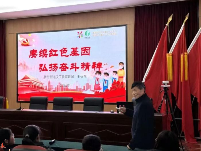 2 月 9 日,绿园社区新时代文明实践站特邀新街街道关工委宣讲团的王伙生老师,为辖区孩子们带来了一场以 “赓续红色基因 弘扬奋斗精神” 为主题的红色教育活动,让孩子们在鲜活的革命故事中认识英雄、缅怀英雄,把爱国的种子种在心里。